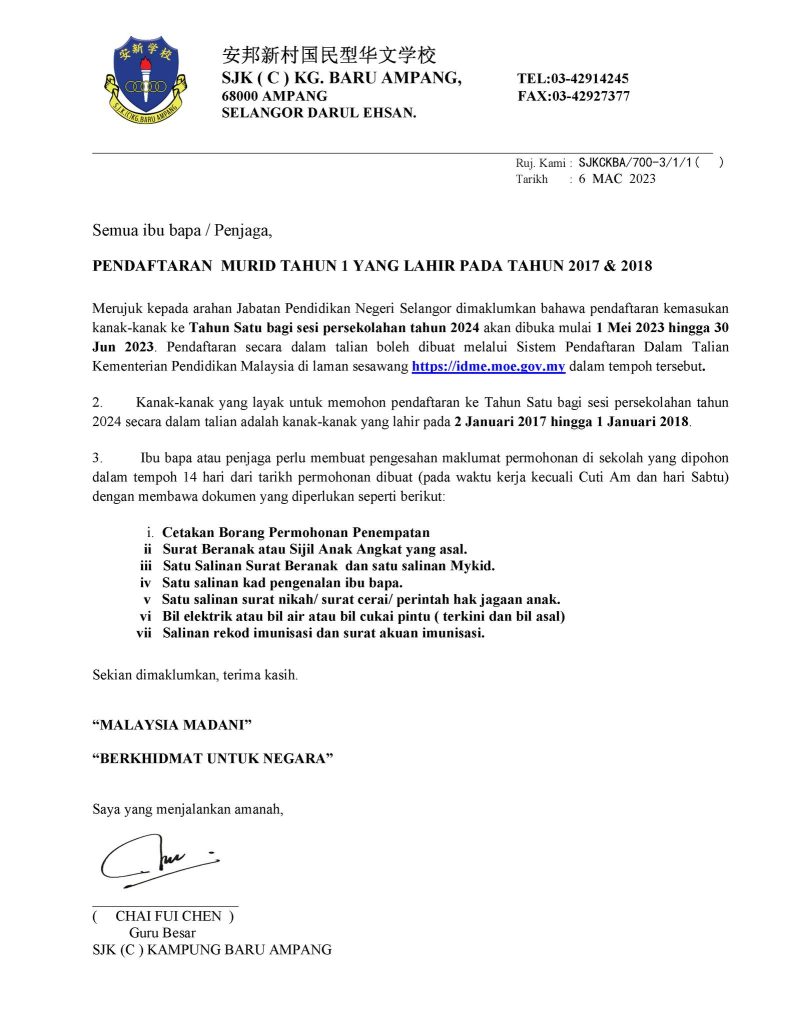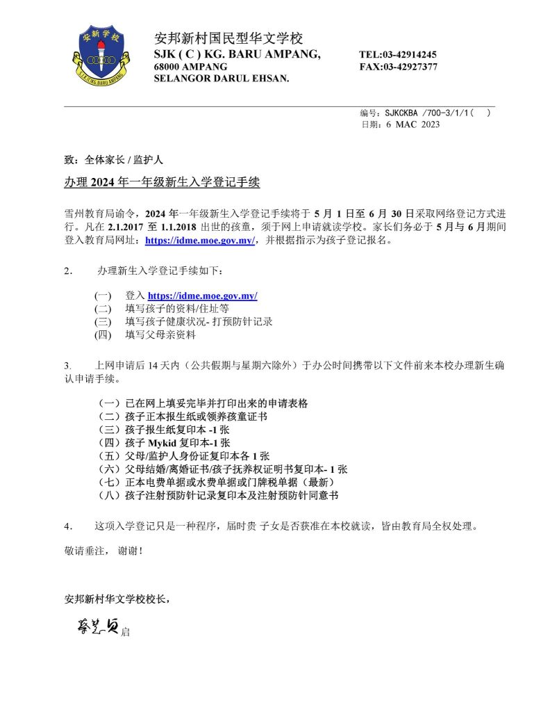 办理2024年一年级新生入学登记手续 Pendaftaran Murid Tahun 1 Yang Lahir Pada Tahun 2017 & 2018