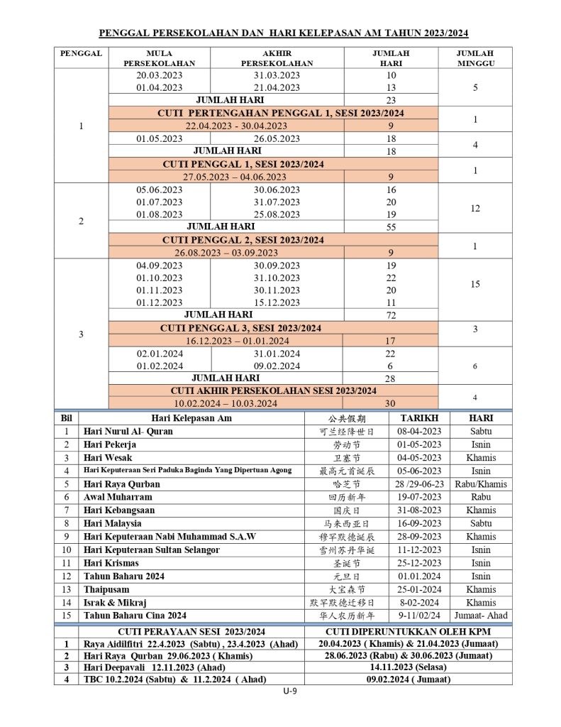 Penggal Persekolahan dan Hari Pelepasan Am Tahun 2023/2024